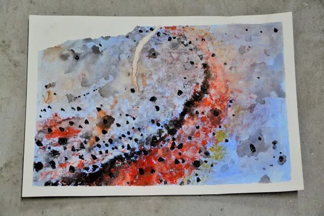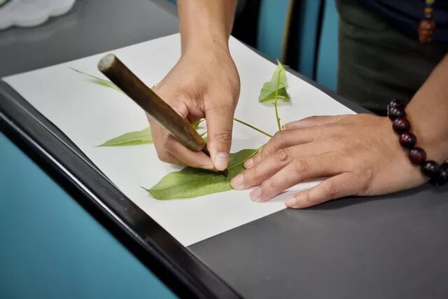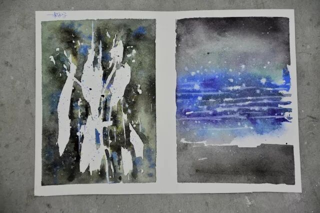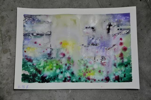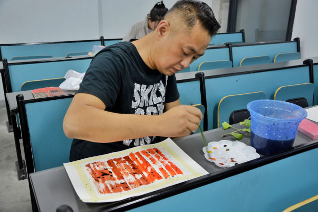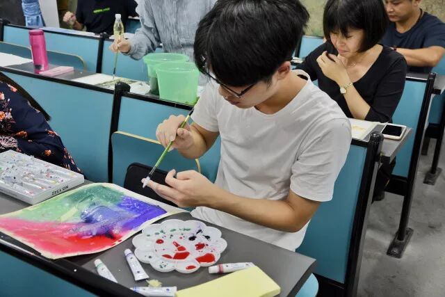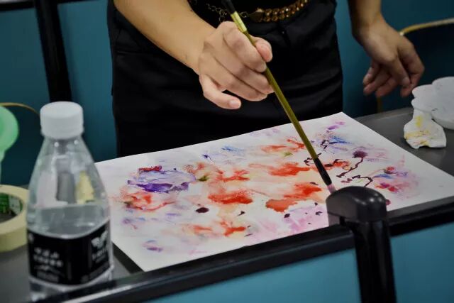 在教学实践环节中,罗老师与学员们进行水彩技法练习,罗老师先为学员们介绍水彩的基本特点和用法,之后学员们在老师的指导下,采用理论课程中介绍的手绘、喷洒、压印等多种技法,根据自己的创作思路提取元素进行创作。