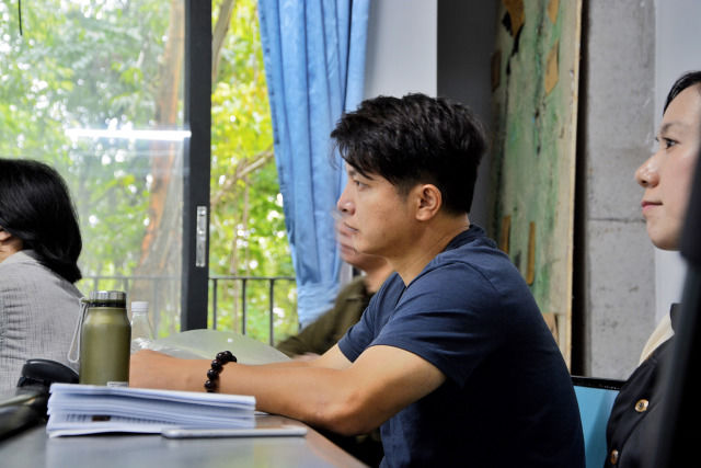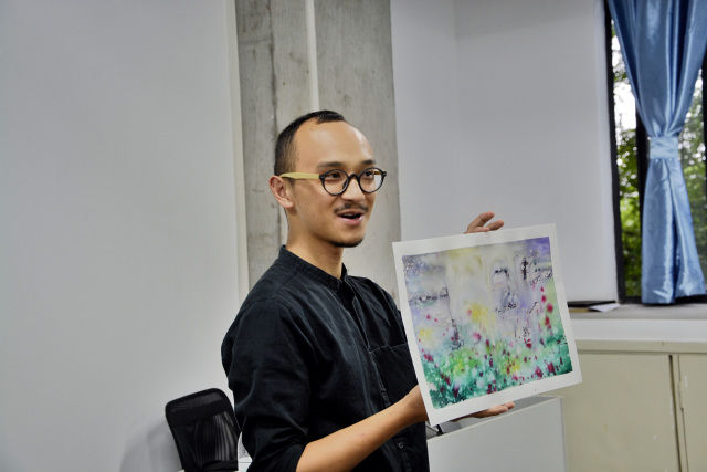 在课程结束前,罗杰老师对学员的作品进行点评。罗老师提到学员高华梁的作品运用红蓝两种色彩,画面相对和谐,但是过多黑色的晕染使得画面显得有些脏,黑色灰色等色彩难度较大可以尽量减少应用。而对学员王祥勇的作品,罗老师指出画面中不确定的晕染给画面添彩。