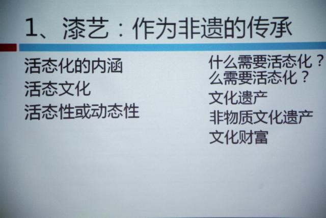 何为漆艺的活态化?这是郑川老|师在讲|座中提出的第一个问题,以此引发学|员们的思考。他以博物馆中陈列的展品为例,这些作为物质遗产的展品虽然具有重要的历|史价值、文化价值和考古价值,但却可能已经失去了与时代需要相适应的生命力;而以驾驭生漆等媒介材料的工艺技术在内的非物质文化遗产,则结合当代文化需qiú和社|会需要具有再创造、可利|用等性质,从而决定其活态性价值及活态化开发的可能。