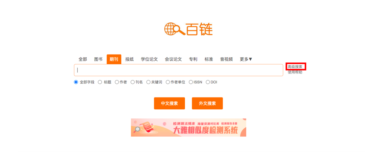高级搜索:点击搜索框后面的“高级搜索”链接,进入高级搜索页面,通过高级搜索更精确地定位您需要的文献。