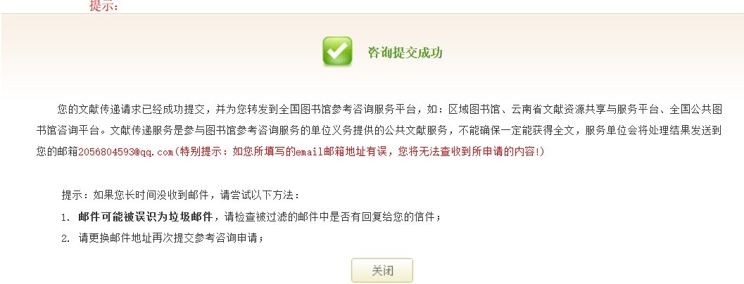 所谓文献传递,就是图书馆参考咨询中心通过E-mil快速准确的将您需要的资料发送到您自己的邮箱,供您全文阅读。此服务免费!以期刊为例,在期刊详细信息页面,您可以在如下位置点击“图书馆文献传递中心”,进入“图书馆 参考咨询服务”页面。在图书馆参考咨询服务页面,请您认真仔细填写如下信息,以确保提交无误。最后点击“确定”即可。