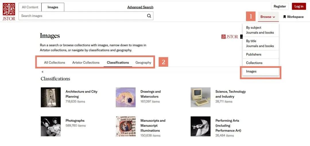 期刊与书籍目前已有四种分类方式,“按学科”“按标题首字母”“按出版商首字母”“按馆藏合集”。图像可按学科、地区等方式分类浏览。