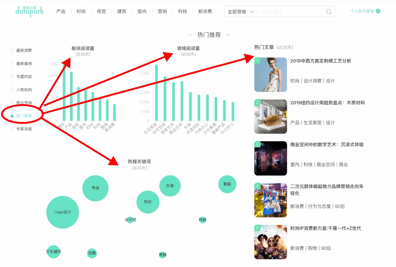 通过首页“行业关注”可洞察全网的焦点内容,“热门推荐”可以了解全站的使用数据。