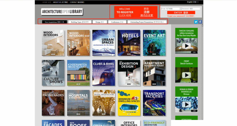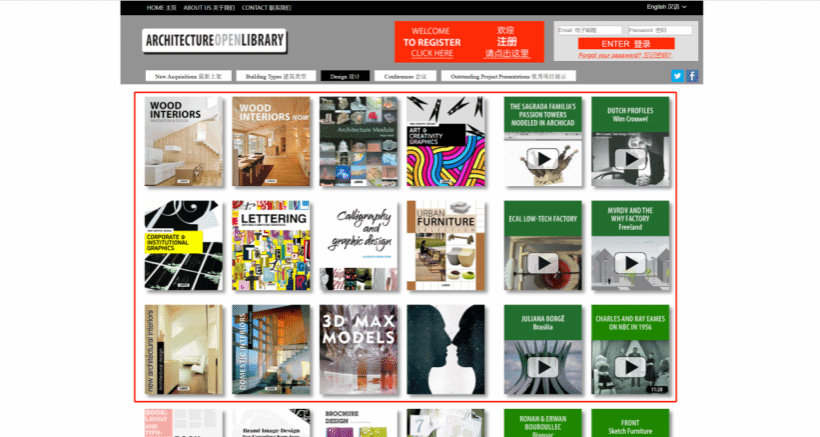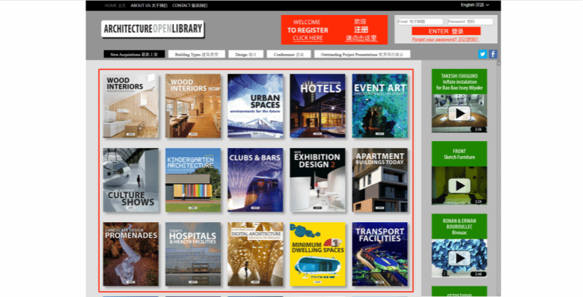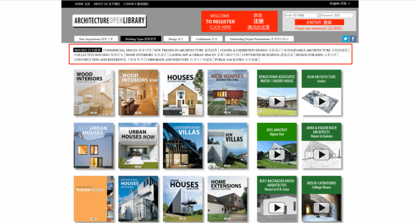 点击“建筑类型”,可以看 HOUSES 住宅建筑、COMMERCIAL SPACES 商业空间、 NEW TRENDS IN ARCHITECTURE 建筑趋势、 STANDS & EXHIBITION DESIGN 会展设计、SUSTAINABLE ARCHITECTURE 可持续建筑、COLLECTIVE HOUSING 集体住宅、 HOME INTERIORS 室内设计、 LANDSCAPE & URBAN SPACES 景观与城市空间、 CONVERTED BUILDINGS 建筑改造、 DESIGN FOR KIDS 儿童专区、 CONSTRUCTION AND REFERENCE 工程参考书、CORPORATE AND INDUSTRY 公司与工业建筑、PUBLIC FACILITIES 公共设施等类别的数字资源,点击感兴趣的资源即可观看。
