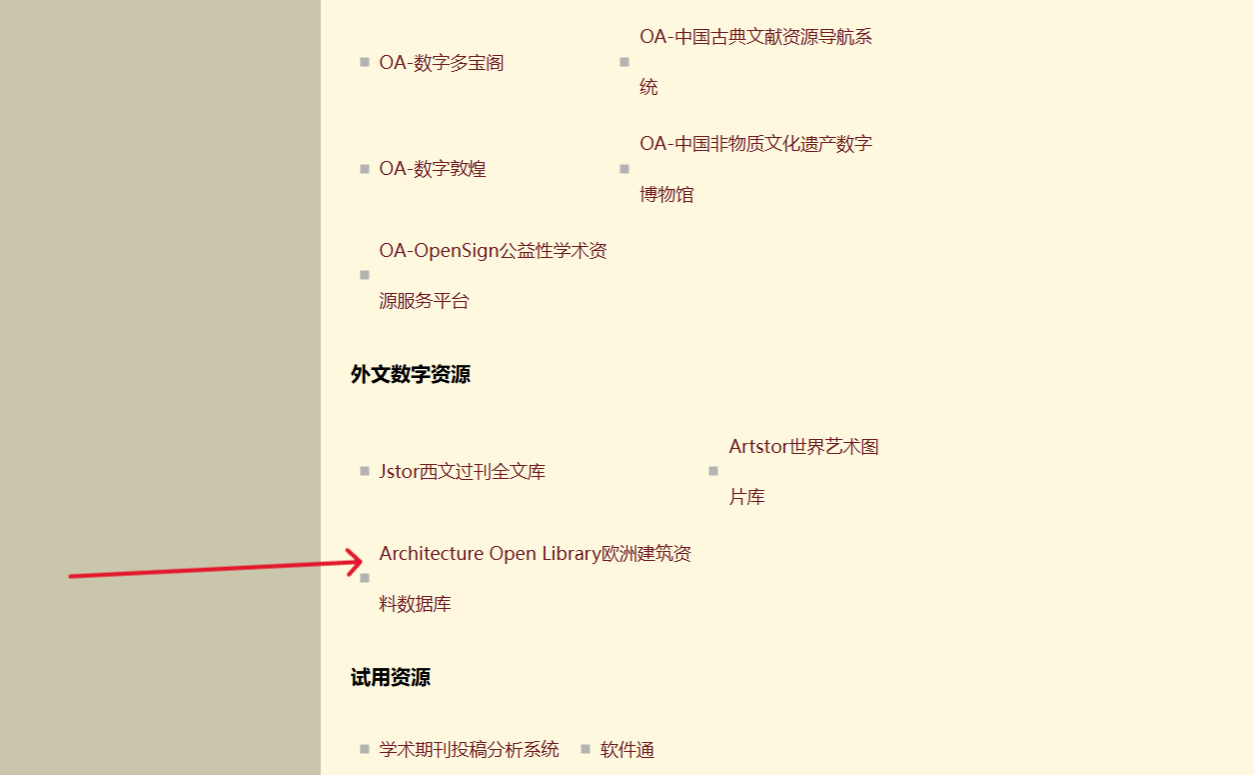 第二步:进入万象城平台图书馆,选择Architecture Open Library欧洲建筑资料数据库。