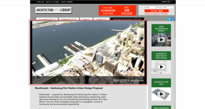 点击“优秀项目展示”,可看到优秀的建筑、公共空间设计案例分享视频,例如,Maxthreads可视化英国(Vimeo)发布的高雄港站城市设计提案分享等。