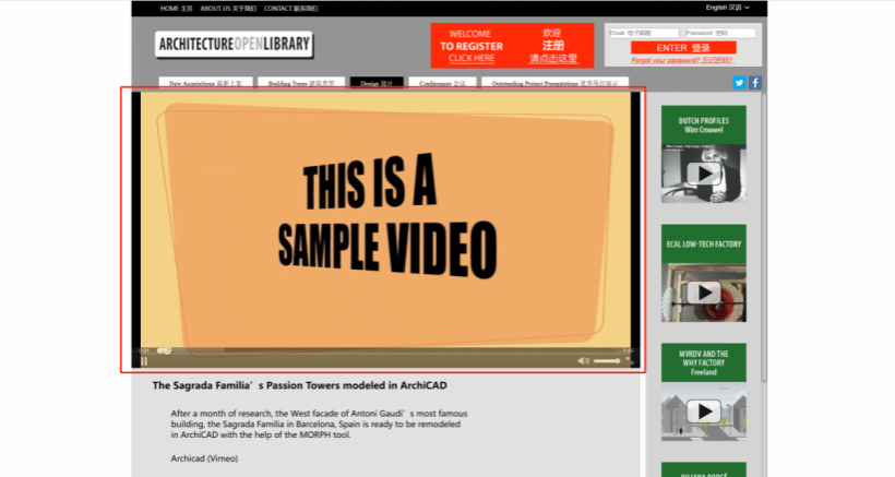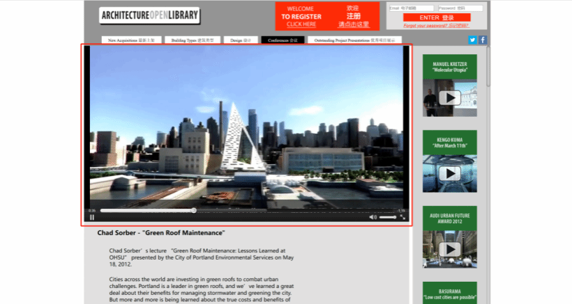 点击“会议”,可看到建筑类会议记录视频,例如:查德·索伯的经验分享讲座“绿色屋顶维护”在俄勒冈州立大学举办。本模块展示了建筑领域的最新设计理念和先进技术,能够帮助师生快速了解行业动态和新技术。此外,还有著名建筑师的经验传授、纪录片等,例如:“天才建筑师塞尔特的故事”等。