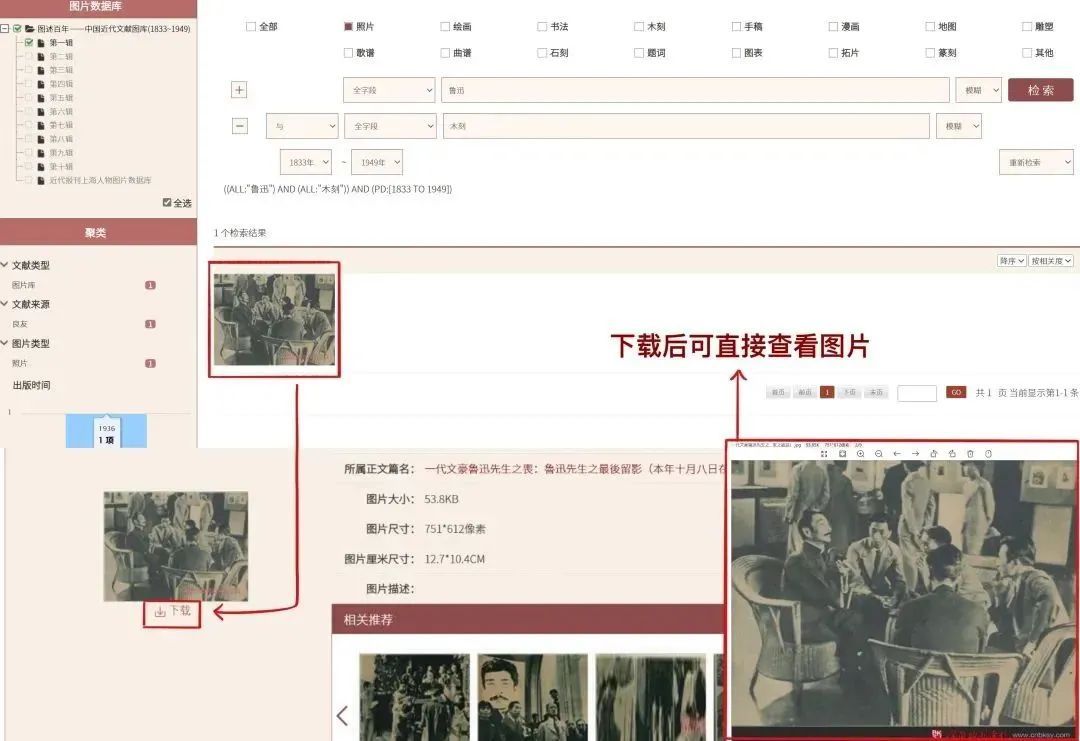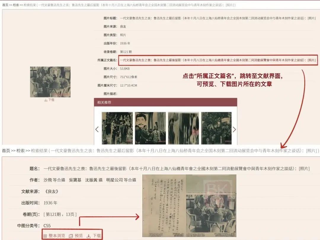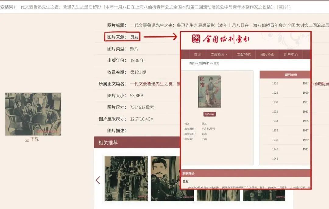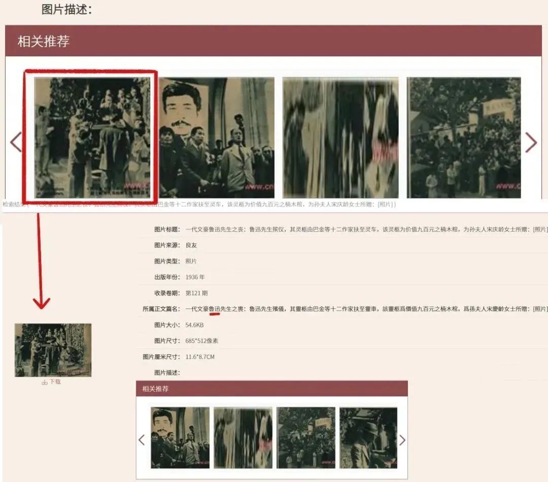 图片信息界面不仅能下载图片,也能查看相关推荐中的关联图。如检索鲁迅先生在第二回全国木刻流动展览会的照片,这张照片是鲁迅去世前沙飞先生拍的,关联图片就显示出“一代文豪鲁迅先生之丧”相关报道的一系列图片。通过图片的相关推荐,能帮助我们了解检索图片相关的系列图片和事件,辅助资料的查找。