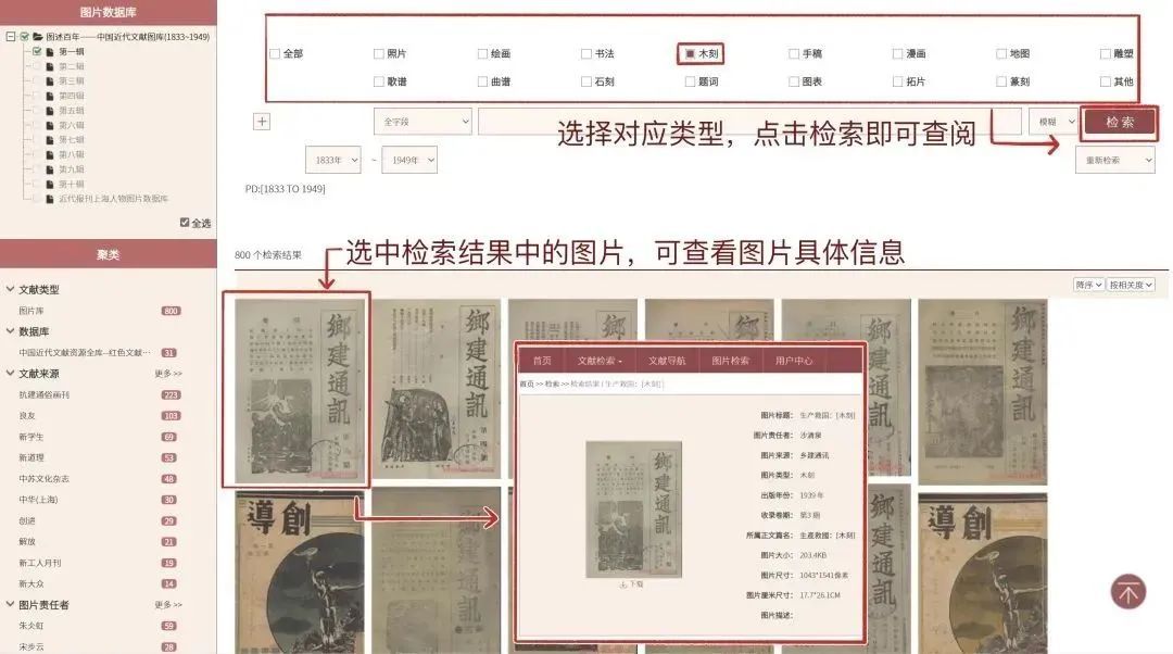 数据库提供的分类检索项包括照片、绘画、书法、木刻手稿、漫画、地图、雕塑、歌谱、曲谱、石刻、题词、图表、拓片、篆刻、其他。选择需要检索的图片类型,点击检索即可获取该类型所有相关图片资源。选中检索结果中的图片,即可查看图片的具体信息。
