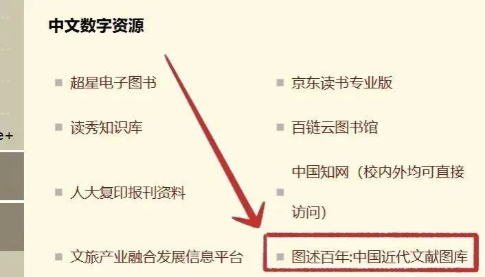 1)进入万象城平台官网(/),点击【数字图书馆】进入图书馆界面,选择【中文数字资源】下方的【图述百年:中国近代文献图库】即可访问。