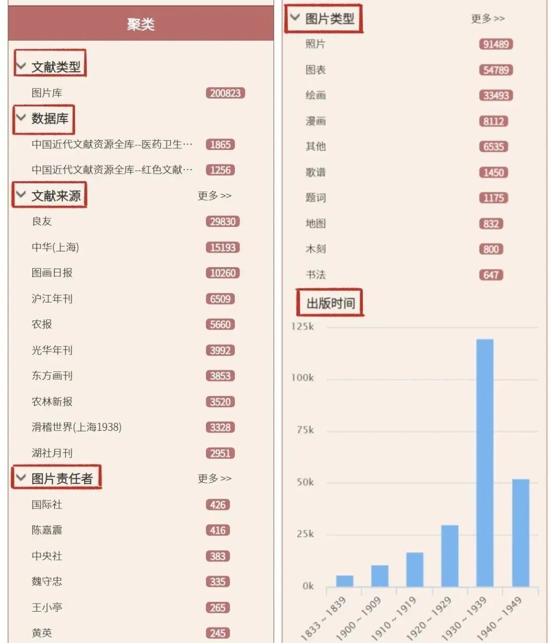 在检索框进行检索后,一框式检索的左下方会显示聚类检索。聚类项包含“文献类型”“数据库”“文献来源”“图片责任者”“图片栏目”“图片类型”“出版时间”等检索项,选择需要的类型,缩小检索范围,可进行更精确的条目定位。