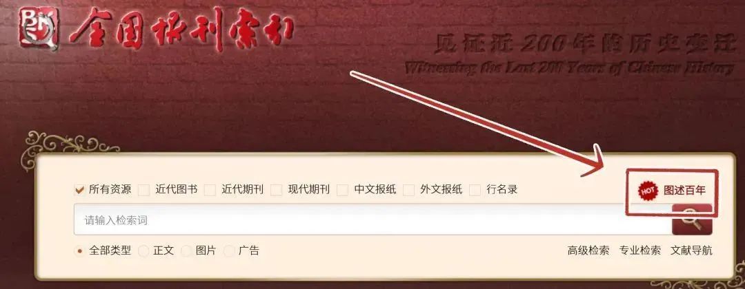 2)在校园网范围内进入【全国报刊索引】界面(https://www.cnbksy.cn/),点击导航栏右侧的【图述百年】,即可进入数据库。