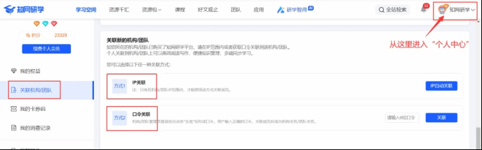 2. 关联学校(根据学校实际情况,以下二选一即可)登录平台后-点击右上角头像——点击左侧关联机构/团队——选择IP关联登录平台后-点击右上角头像——点击左侧关联机构/团队——选择口令关联,输入6位口令(RNPBPU),点击“关联”即可。