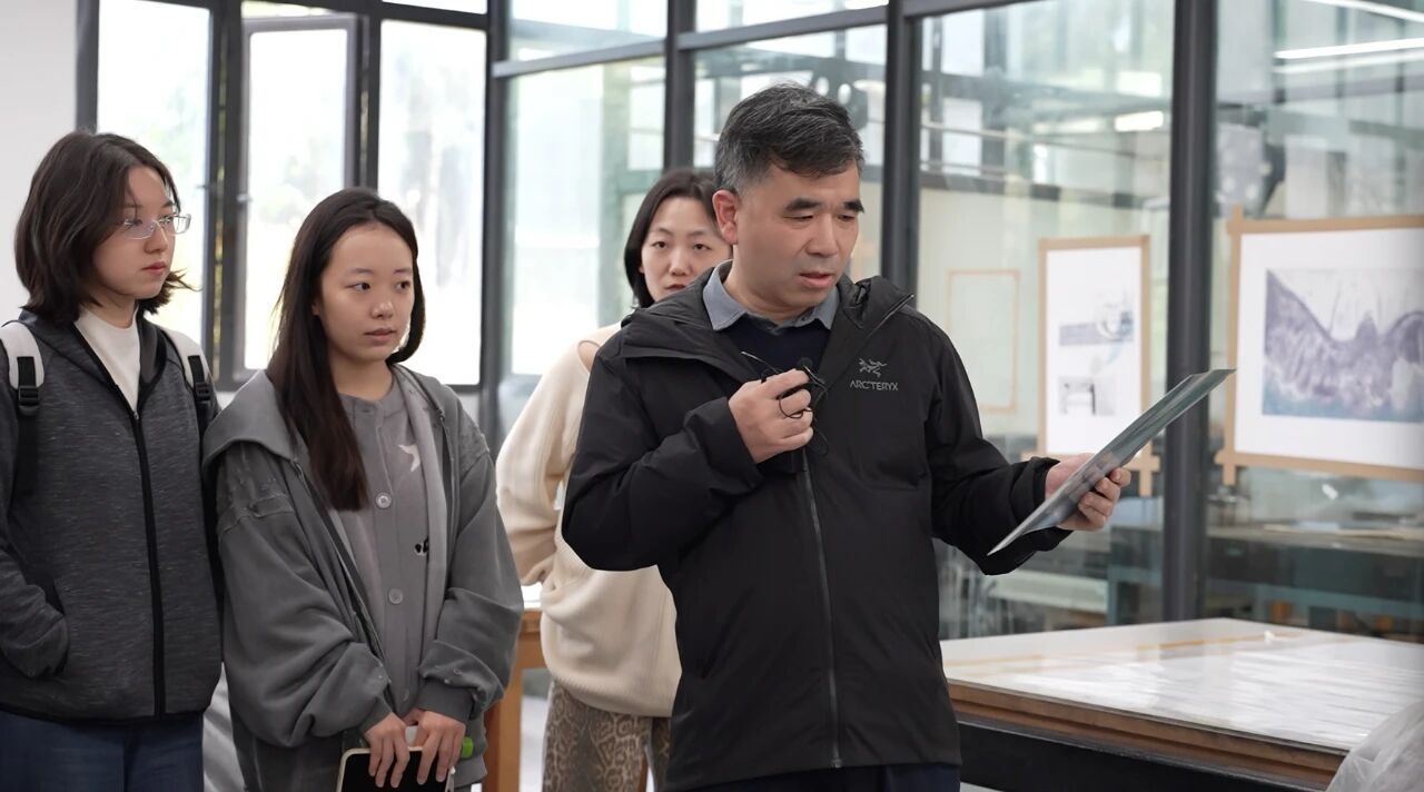 讲座正式开始前,付继红带领同学们参观了版画系的四间工作室,分别是铜版工作室、石版工作室、丝网版画工作室与木刻版画工作室。参观途中,他结合工作室里学生正在创作的版画作品,讲解了不同种类的版画所需的材料、专用机器及制作步骤,帮助同学们建立起对版画艺术的初步认知。讲座中,付继红首先为同学们讲解藏书票的定义与特质。他介绍,藏书票是以艺术的方式标明书籍归属的小型标志,同时也是书籍的美化装饰一部分。其尺寸一般在15×15厘米以内,因小巧精致被誉为“版画珍珠”“纸上宝石”,多贴于书籍的首页或扉页上。除主图案外,藏书票还需标注藏书者的姓名或别号、斋名等,国际上通行在票上写上“EXLIBRIS”这一行拉丁文字,意味“属于私人藏书”。