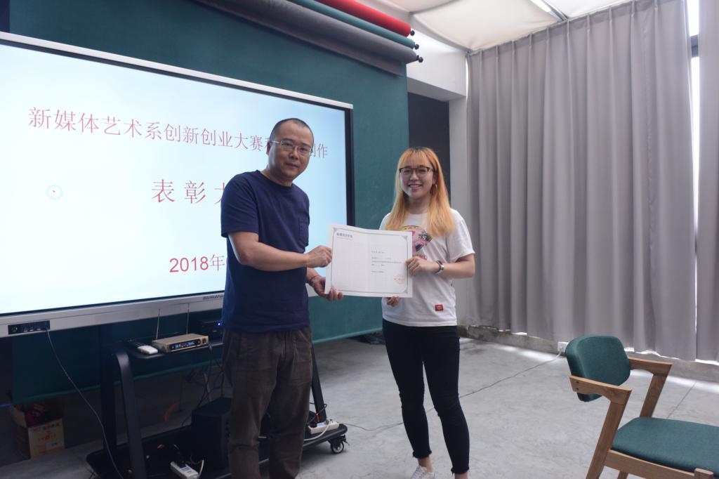 李川老师宣读了新媒体艺术系的表彰决定,并对获奖的7位同学颁发了奖励证书和奖金。获奖同学代表李昊星介绍了参加创新创业大赛的规则、最初思路、团队组建等情况。