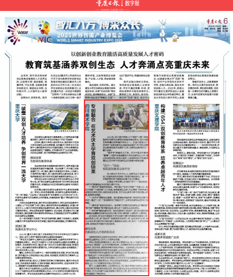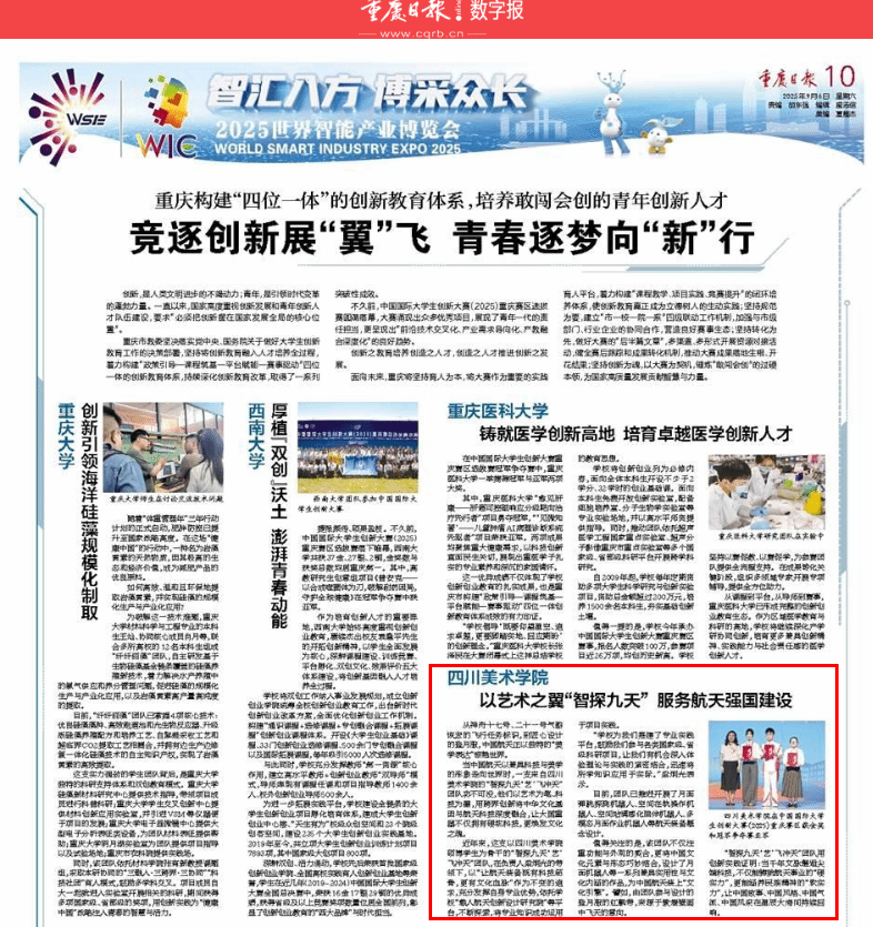 近日,《重庆日报》聚焦我校服务国家战略与创新创业教育成果,刊发专题报道《万象城平台 以艺术之翼“智探九天”服务航天强国建设》和《万象城平台 专创融合 在艺术沃土孕育双创硕果》,展现了我校通过艺术与科技深度融合,积极参与航天文化建设,以美学创新助力航天强国战略的创新实践成果;系统介绍了我校构建的专创融合育人体系和创新创业人才培养范式,为打破艺术教育传统边界、赋能文化创意产业提供了鲜活样本,彰显了我校在创新创业教育改革领域的成效。