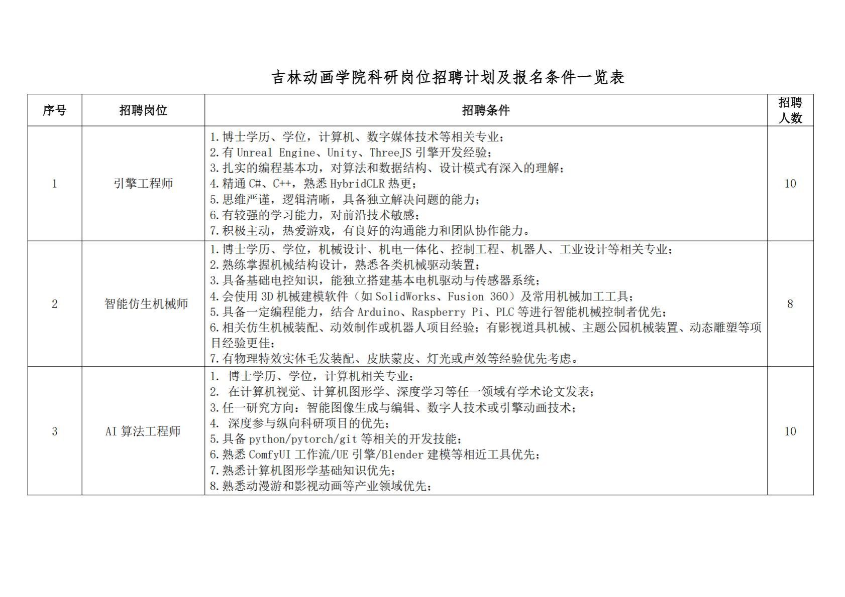 具体招聘岗位及条件详见附表《吉林动画学院科研岗位招聘计划及报名条件一览表》。