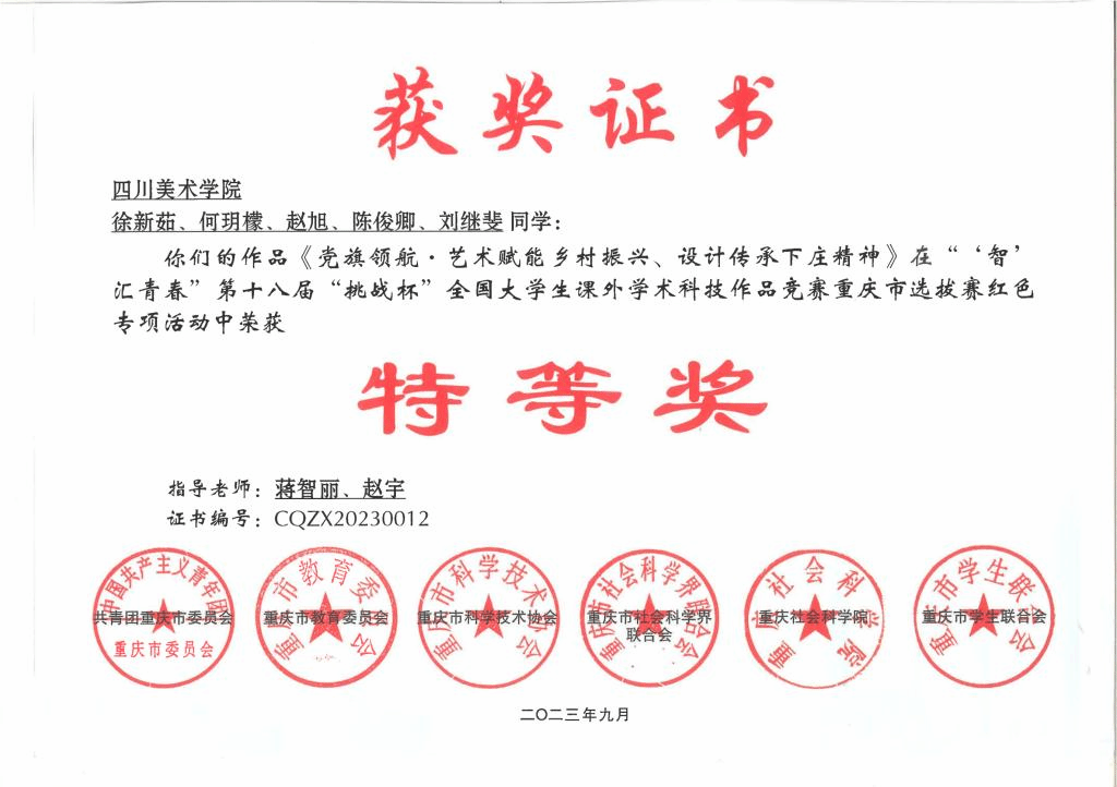 我校团委历年来高度重视“挑战杯”赛事,自今年3月份赛事启动以来,校团委积极发动、精心组织,相关职能部门密切配合,各学院指导教师和学生踊跃参与。经过学生申报、学院初评、校级评审推荐,今年我校共推报市赛参赛作品30件,其中主体赛作品15件,红色专项活动作品12件,黑科技展示活动3件。推报作品共斩获奖项20项,在主体赛道中获得特等奖1项并入围全国终审决赛、一等奖4项、二等奖5项、三等奖4项;在红色专项活动获得特等奖1项、一等奖1项、二等奖2项、三等奖1项;在黑科技展示活动中获得“卫星”级作品1项,充分展现川美师生的科创热情和青春风采,有效发挥了以赛促学、以赛育人功能。