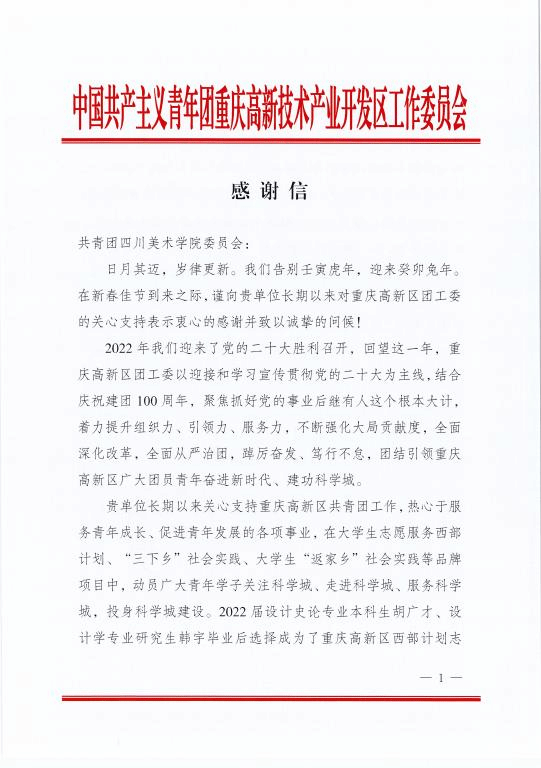 近日,西部(重庆)科学城团工委、高新区团工委向我校团委发来感谢信,对我校团委长期以来关心支持高新区共青团工作,在大学生志愿服务西部计划、“三下乡”社会实践、大学生“返家乡”社会实践等品牌项目中的支持表示衷心感谢。2022年,学校为高新区输送了胡广才、韩宇两名西部计划志愿者,让青春在祖国和人民最需要的地方绽放绚丽之花;动员牟嘉雨、杨欣怡两位同学参与到高新区大学生“返家乡”社会实践活动中,以实干担当绘就青春底色。