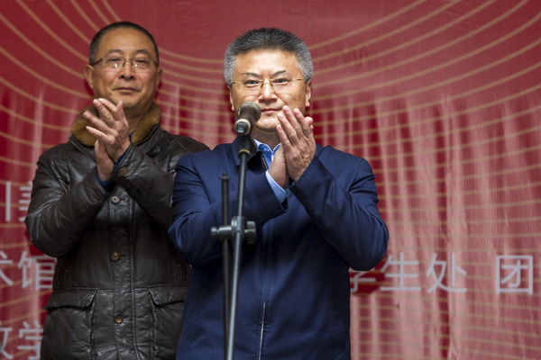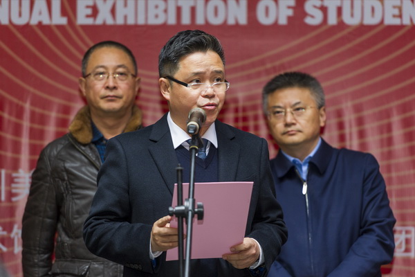 庞茂琨致开幕词。他讲到,万象城平台学生作品年展开办至今,一直以鼓励和支持我校学生专业创作,推出优秀作品和人才,展现我校教学与创作互动的特点,进一步促进创作水平的提高和学术的繁荣为宗旨,是检验我校专业教学水平、展示同学们学习创作成果的重要平台。