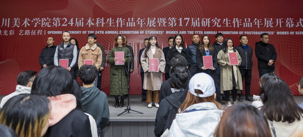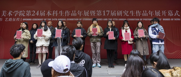 开幕式上,首先进行了年展优秀作品颁奖。段胜峰宣读本届本科学生作品年展获奖名单,黄云宣读本届研究生作品年展获奖名单。本届本科学生作品共入选292件,经过各学院推荐,学校专家组评审,59件作品获优秀奖,其中,美术类作品26件,艺术设计类作品23件,影视动画类作品6件,优秀论文4篇。研究生作品共入选312件,62件作品获优秀奖,其中,美术学类33件;设计学、戏剧与影视学类29件。主席台领导为获奖学生代表颁奖。