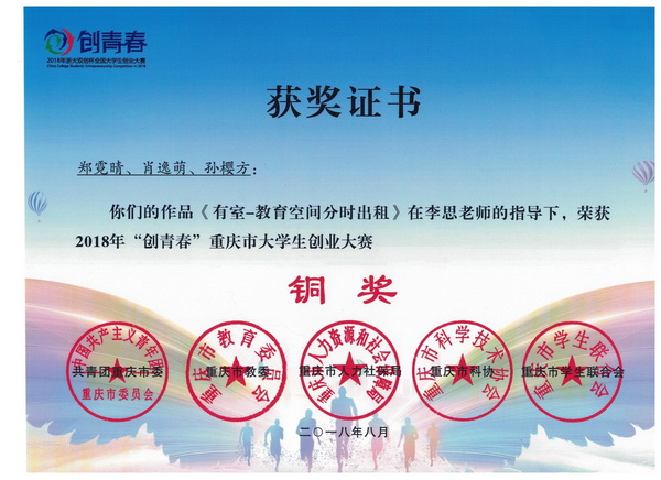 为深入学习贯彻和落实党的十九大精神和习近平新时代中国特色社会主义理想,引导和激励高校学生弘扬时代精神,把握时代脉搏,将所学知识与社会经济发展紧密联系,培养和提高青年大学生的创新、创意、创造、创业的意识和能力。团市委、市教委、市人力社保局、市科协、市学联于2018年3至8月联合举办2018年“创青春”重庆市全国大学生创业大赛(中国青年创新创业大赛大学生组),此次大赛下设大学生创业计划竞赛(即“挑战杯”中国大学生创业计划竞赛)、创业实践挑战赛、公益创业赛3项主体赛事。