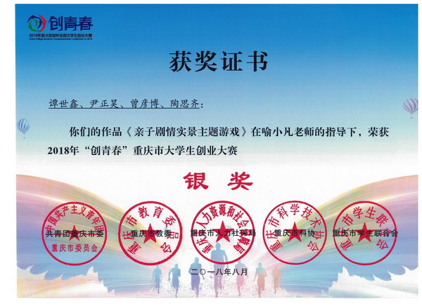 我校团委组织申报作品7件,包括大学生创业计划竞赛(即“挑战杯”中国大学生创业计划竞赛)6项,创业实践挑战赛1项。其中4件作品获奖,包括“银奖”1件,即设计艺术学院项目《亲子剧情实景主题游戏》(项目负责人:谭世鑫 团队成员:谭世鑫、尹正昊、曾彦博、陶思齐 指导老师:喻小凡);“铜奖”3件,分别是:中国画系项目《“有空间”——水墨衍生艺术中心》(项目负责人:杨玲 团队成员:杨玲、敬业佳、万秋妍 指导老师:肖志)、建筑艺术系项目《“有室”培训空间分时出租平台》(项目负责人:郑霓晴 团队成员:郑霓晴、肖逸萌、孙樱方 指导老师:李思)、手工艺术学院《水木衍漆艺工作室》(项目负责人:郝中友 团队成员:郝中友、王晓刚、钟忆雪、陈婷、杨盛宇 指导老师:杨洋)