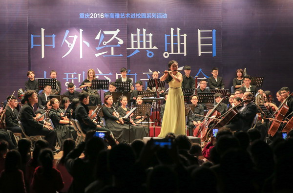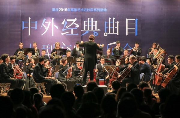 11月2日晚7点,由重庆市教委主办、西南大学交响乐团担纲演出的“2016高雅艺术进校园中外经典曲目”大型交响音乐会在我校多功能厅举行。学校党委副书记左益出席活动,全校师生员工济济一堂,欣赏了一堂高质量的音乐盛宴。