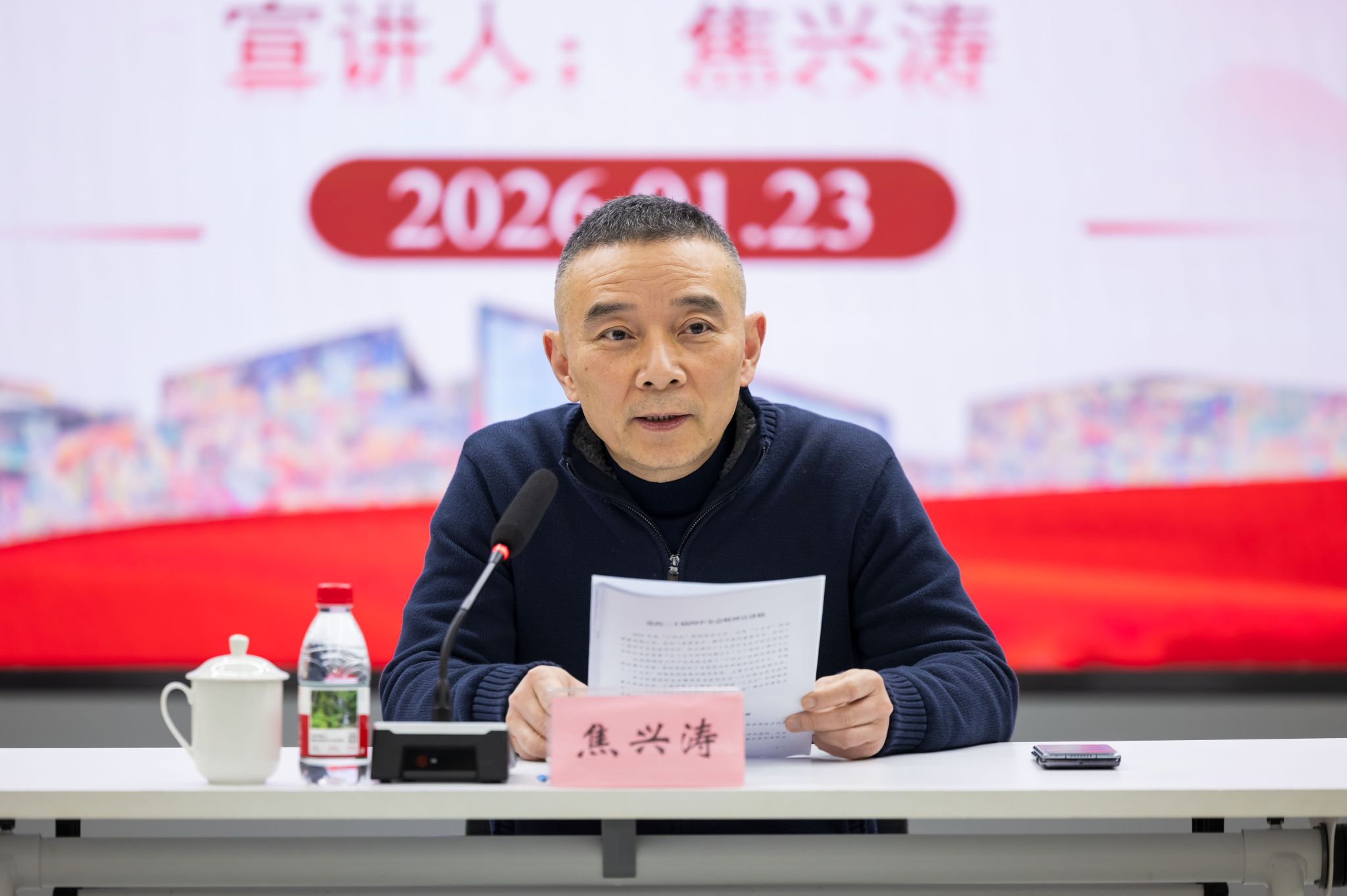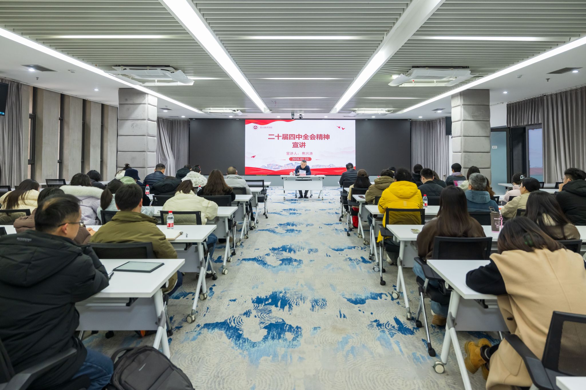 1月23日下午,焦兴涛院长面向研究生院、审计处、美术馆、学报编辑部的党员干部以及艺术人文学院、艺术教育学院教职工宣讲党的二十届四中全会精神。