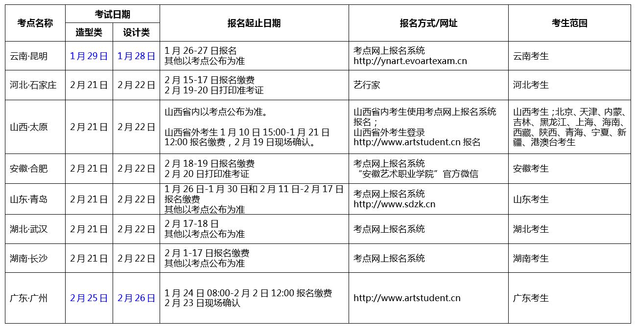 为了方便考生及家长报名,经与考点进一步沟通,现将各考点报名时间和报名系统明确如下表,请考生合理安排时间,及时报名,准时参加考试。