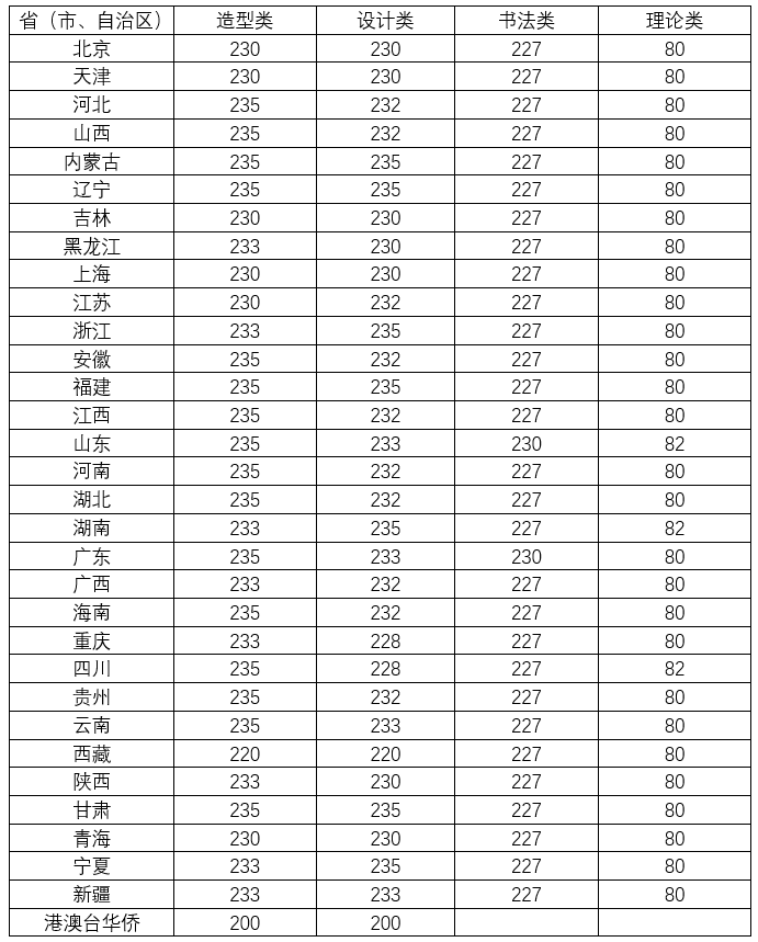 (一)造型类、设计类、书法类、理论类的合格分数线