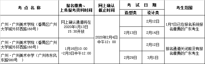 2.设计类考生可选择广州市美术学院考点报名参加2月12日的考试或选择广州市美术中学考点参加3月1日的考试,如考点当日考位已满将只能选择有剩余考位的考点参加考试。