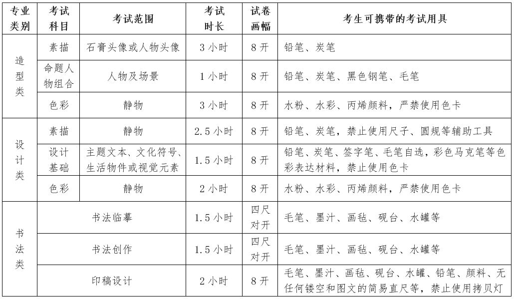 ②书法类:书法临摹和书法创作试卷均为四尺对开(斗方)宣纸一张,印稿设计试卷为8开素描纸一张。