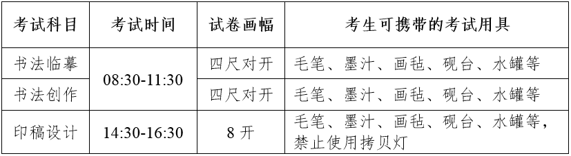 注:书法临摹和书法创作两个科目考试连续进行,中途不休息。