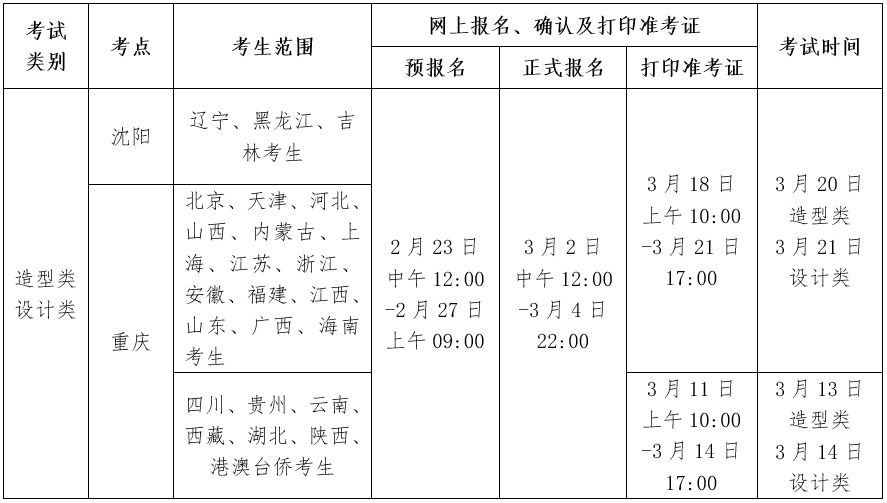 为深入贯彻落实《教育部办公厅关于做好2021年普通高校部分特殊类型招生工作的通知》等文件精神,做好新冠肺炎疫情防控常态化下的招生考试工作,经学校研究决定,现就我校2021年沈阳、重庆考点造型类、设计类本科招生专业考试相关事宜公告如下: