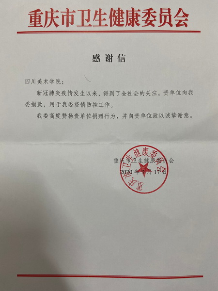 3月17日,重庆市卫生健康委员会给学校发来感谢信,高度赞扬了学校的捐款行为,并向学校致以诚挚谢意。